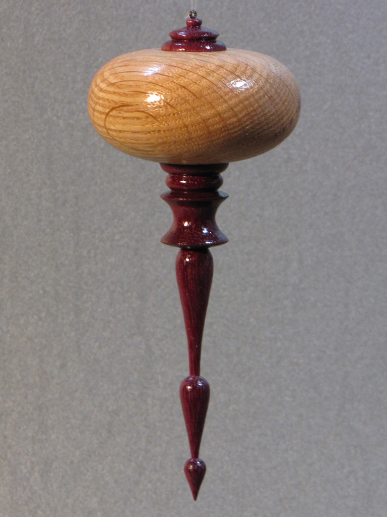 Description: Covetto and Teardrop Ornament with hollow Oak Globe and Purple Heart Cap and Finial